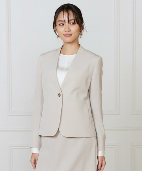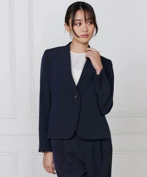 すっきりとしたVゾーンが美しいノーカラージャケットです。1つボタン仕様でさらっと羽織っても様になるデザインです。ナチュラルな2WAYストレッチが魅力でオールシーズン着用して頂けます。同素材のパンツ・スカートとのセットアップとしてはもちろん、単品ジャケットとしても合わせやすい汎用性のある一枚です。ビジネスシーンだけではなく、セレモニーシーン・フォーマルシーンにもご対応いただけます。