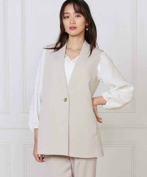 ジレは深めのVあきに長めの着丈、後ろにフレアーを入れたデザインで女性らしいバランスの一着。高めの位置にボタンを配しているのでボタンを留めればよりすっきりと着用いただけます。ブラウスを合わせたきれいめな着こなしはもちろん、Tシャツやニットを合わせてカジュアルダウンするのもおすすめ。デイリーからオフィスシーンまで幅広く活躍してくれる上質なアイテムです。