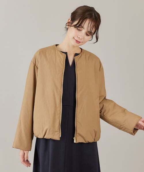裾にギャザーを入れ、バルーンシルエットに仕上げたコンパクトなブルゾン。フロントのゴールドファスナーがカジュアルになり過ぎず、品よく着られる1枚に。丸みのある袖のシルエットで女性らしさも演出できます。短めの着丈なので、ワイドパンツやスカートとのスタイリングがおすすめ。通勤にもデイリーにも活躍する万能アウターです。