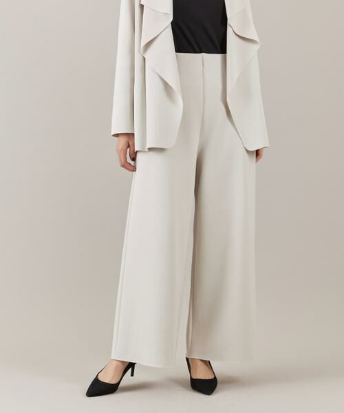 柔らかくて膨らみ感のあるダンボールニットの断ち切り仕立てのワイドパンツ。肌触りがソフトで着心地が良く、シワにもなりにくいです。万能に何にでも合わせやすく、春夏はシャツやブラウス、秋冬はニットを合わせて、オンオフ問わずロングシーズン楽しんでいただける一枚です。ウエストはゴム使いですが、スッキリしたデザインになっているのでカジュアルになり過ぎず、エレガントに着こなしていただけます。