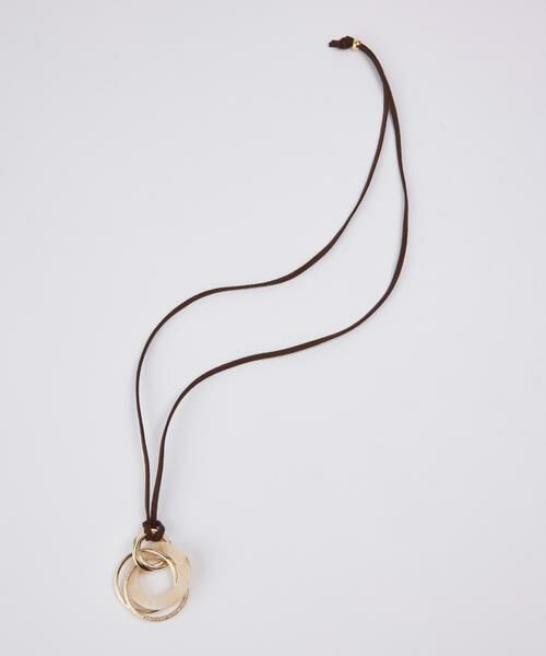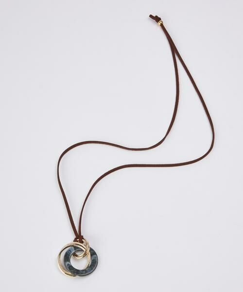 マーブル模様の天然石風アクリルリングに、メタルリングとスウェード紐を合わせたペンダント。シンプルなコーディネイトにプラスして、少し抜け感のある印象に。スウェード紐が描くVラインが顔周りをシャープに見せてくれます。