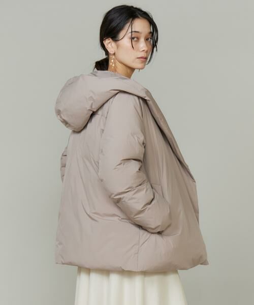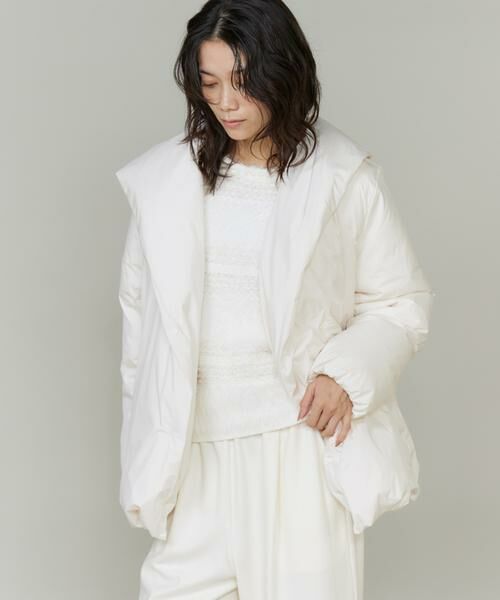 大きめショールカラーフードがエレガントな印象のダウンコート。パーツ毎にダウン分量を変更し着ぶくれして見えない様に仕立ています。腰が隠れる丈で体を包み込む防寒仕様。ややゆったりとしたオーバーシルエットながら、ミニマルで都会的なきちんと見えも叶えるデザインです。袖口も寒い季節に風が入ってこないよう内側にゴムを入れており、裾にはドロスト紐が付いており、お好みのシルエットに絞って調整してお召いただけます。