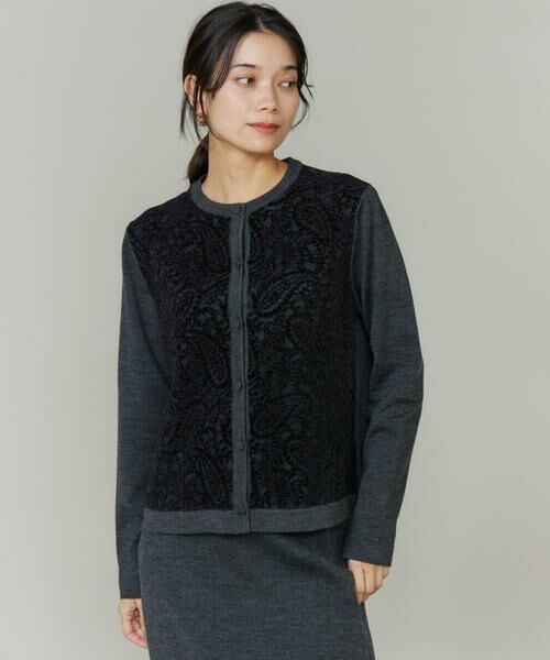 立体感のある繊細なモールレースを前身頃にあしらった、スタイリングを格上げするカーディガン。前身頃はニットとレースの2枚仕立てになっており、上品でリッチ感のある印象に。ニットと同色の包み釦もポイントです。