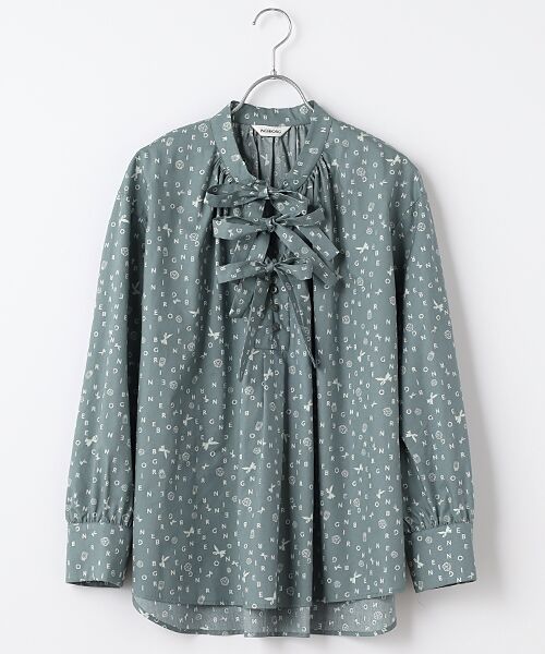 3つのリボンが特徴的なボウタイカラーデザインで、女性らしさを引き立てます。袖口はギャザーが施され、ふんわりとしたシルエットを作り、方部分はギャザーなしですっきり。