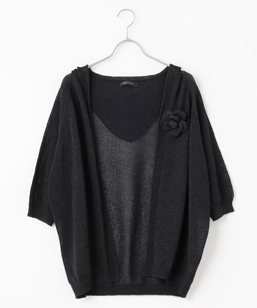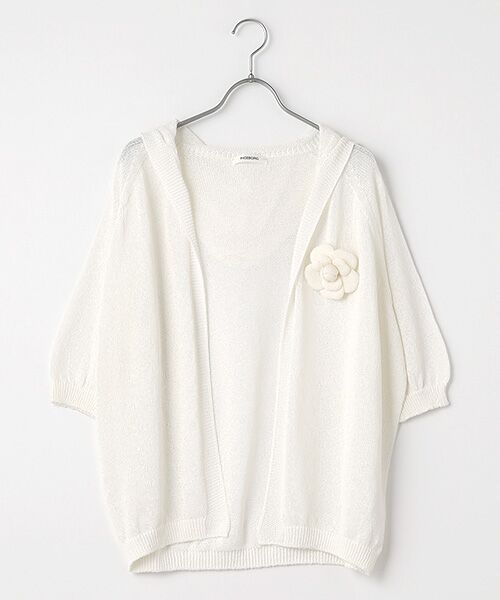 カジュアルなフード付きデザインに、同素材で仕立てたカメリアのコサージュが上品な華やぎを添え、日常使いからお出かけシーンまで活躍。