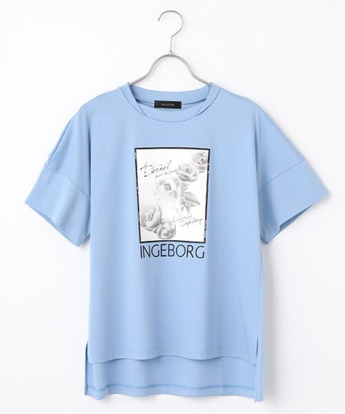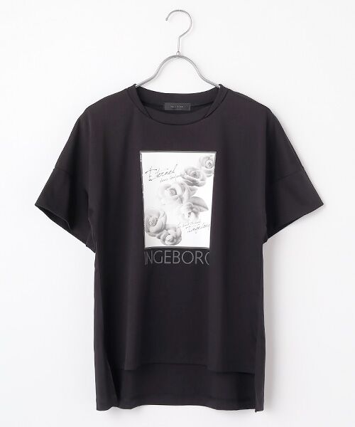 6つのカメリアをロゴリボンでスクエア状に囲んだ印象的なモチーフとロゴがプリントされた、華やかで目を引くカットソートップス。