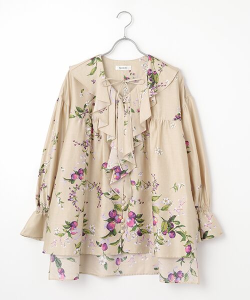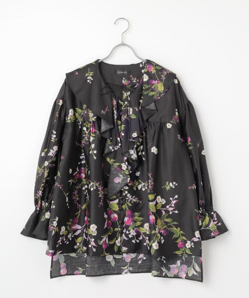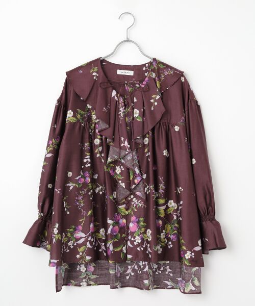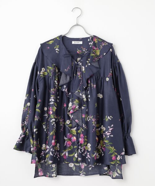 フリルカラーが顔周りを華やかに彩り、前あきのリズムをつけた釦が程よいアクセントに。