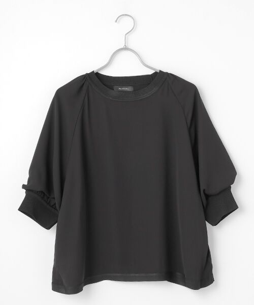 クルーネックに、肩まわりをなめらかに見せるラグランスリーブの半袖デザイン。
