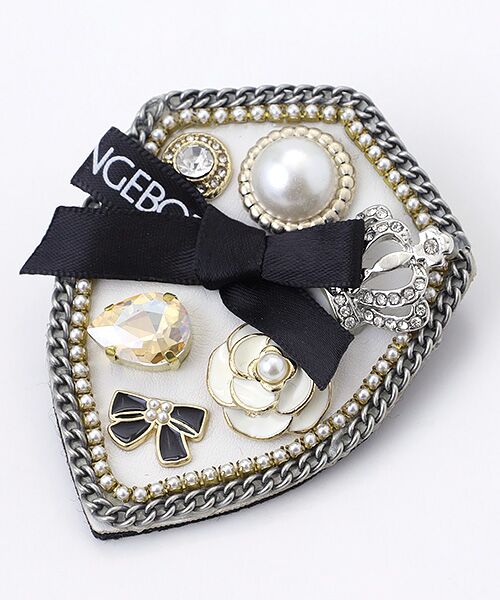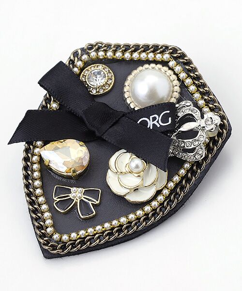 カメリア、王冠、カメリアリボン、サテンリボンパーツを絶妙なバランスで組み合わせた、立体的なエンブレムブローチ。