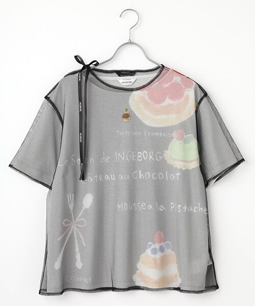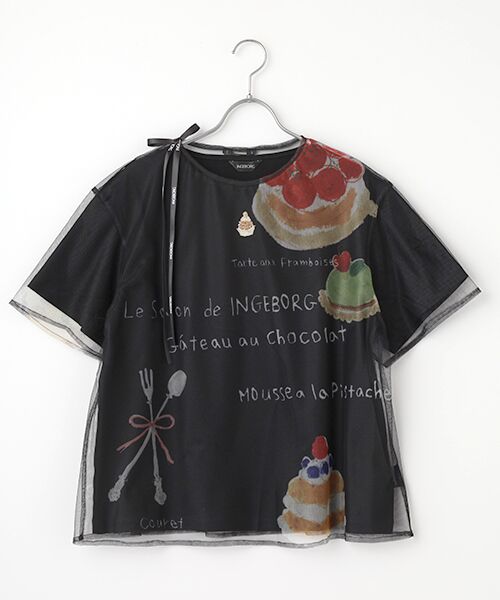 可愛らしいケーキのモチーフを大胆にレイアウトした、Le Salon de INGEBORGオリジナルの総柄プリント(イラストレーターの中川清美氏がSalon de INGEBORG をイメージして描がいたイラスト)が目を引くチュールトップスと、カットソーTシャツを組み合わせた華やかな2点セット。