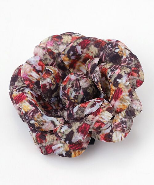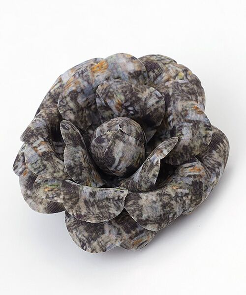 ツイードの上品でクラシカルな風合いが感じられるプリント生地に、立体的なカメリアモチーフが華やかさを添え、フェミニンかつエレガントなアクセントとして幅広いスタイルにマッチします。