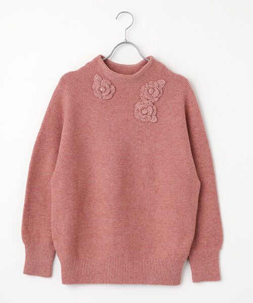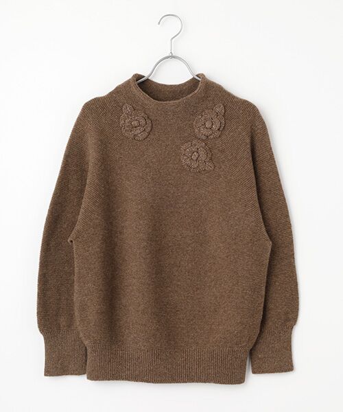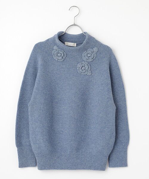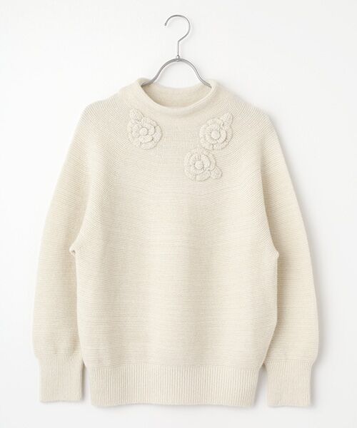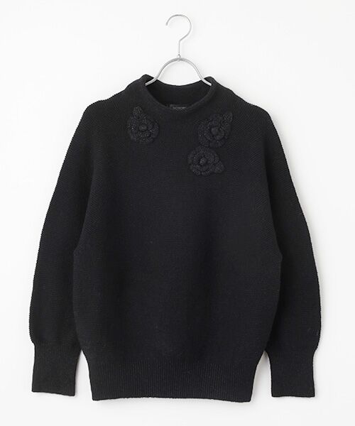 立体感のあるボトルネックが首元を優雅に包み込み、大ぶりのフラワーニットモチーフをリズミカルに3つ配することで、さりげなく華やかな印象を添えています。