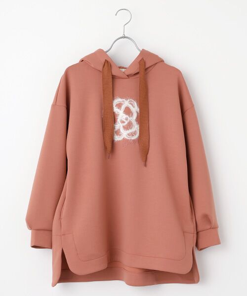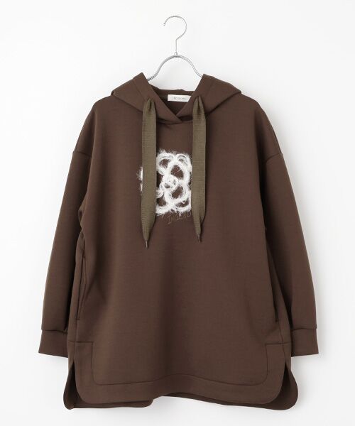 身頃にはフェザーヤーンで繊細に仕上げたふわふわのカメリア刺繍をあしらい、カジュアルな中にも上品さをプラス。