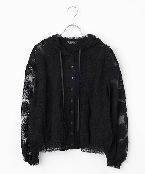 柔らかなチュールテープに変則的なネップ糸で刺繍を施し、上質な高級感を表現したカメリアチュールレースを贅沢に使用したフード付きブラウスです。