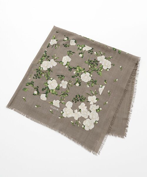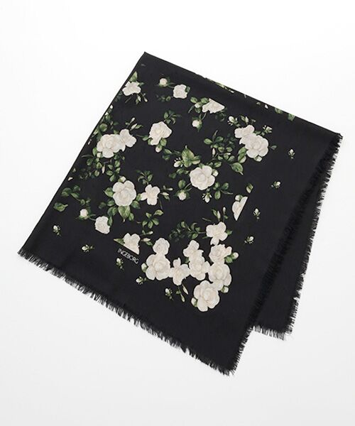 カメリアの華やかなプリントが広がる大判スクエアースカーフ。