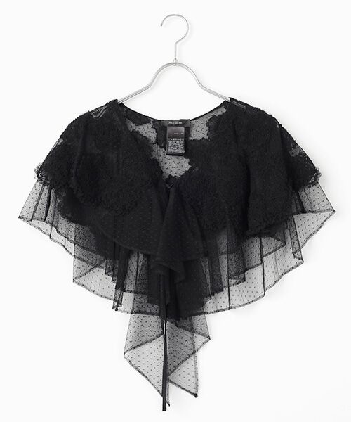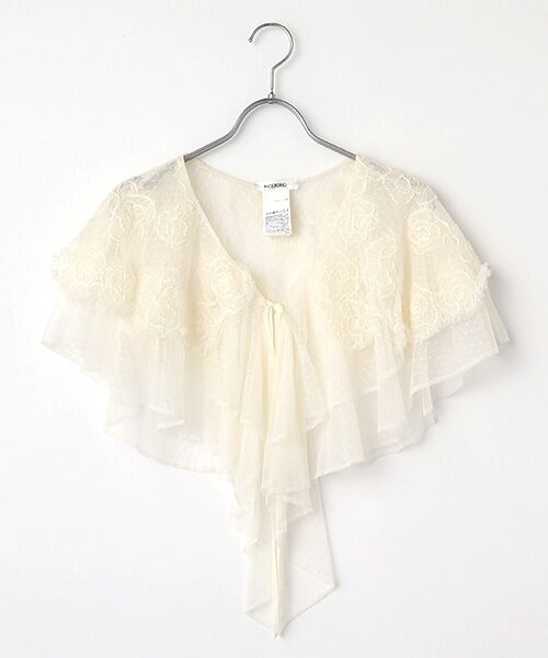 繊細なチュールに立体的に浮かび上がるカメリアの花模様が、優雅な存在感を放つフリルストール。