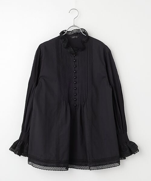 首元を飾るのは、可憐でありながら凛とした表情をもつケミカルレースのフリルスタンドカラー。
