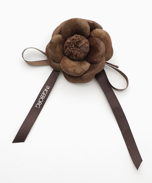 “メゾンドカメリア”プリントに描かれた、チョコレートのようなカメリアコサージュ。