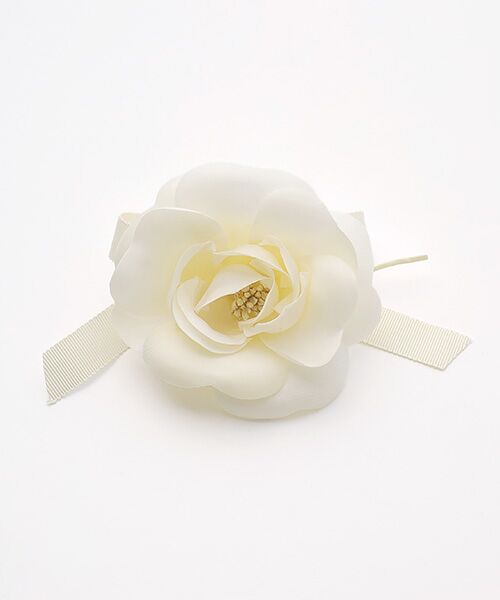 柔らかく動きのある花びらが、まるでそよ風に揺れる花のように優雅に広がるホワイトカメリアコサージュ。