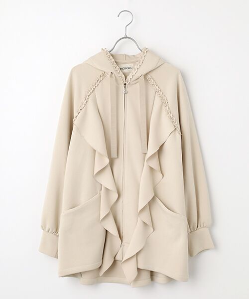 後身頃が長いラウンドヘムラインや、フード口とラグラン切り替え部分の可憐なフリル、縦に広がる身頃のフリルが、動きのひとつひとつに柔らかな陰影を生み、女性らしい優雅さを演出。