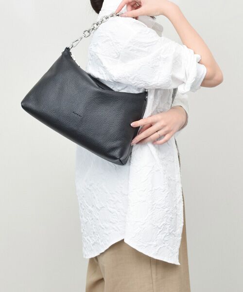 1967年創業した老舗バッグメーカー。長年培ってきたイタリアの職人技によってリパーニ特有のデザインを生み出しています。生産はすべて敷地内にある自社工場でというポリシーを貫き、品質の管理にも重点を置いています。軽い・柔らかい・機能的をベースに、シンプルなデザインに女性らしさとトラッド感を持たせたバッグコレクションとなっています。シボ感のあるソフトなレザーを使用したショルダーバッグは、チェーンストラップがスタイリッシュな印象です。ストラップ付。