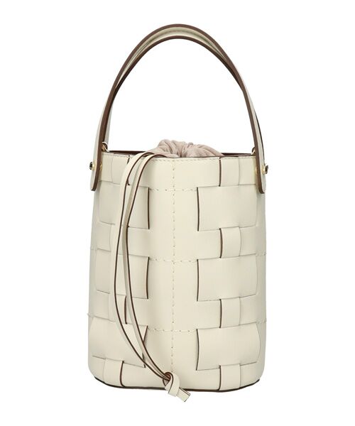 編み込みレザー風のデザインが特徴的なレザーミニバケットバッグは、内側に巾着袋が付いているのも嬉しいポイント。ストラップ付。