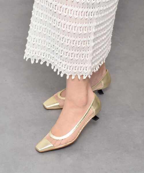 細身に設計されたスクエアトウがスタイリッシュなローヒールパンプスはメッシュ素材で抜け感が涼しげな一足。