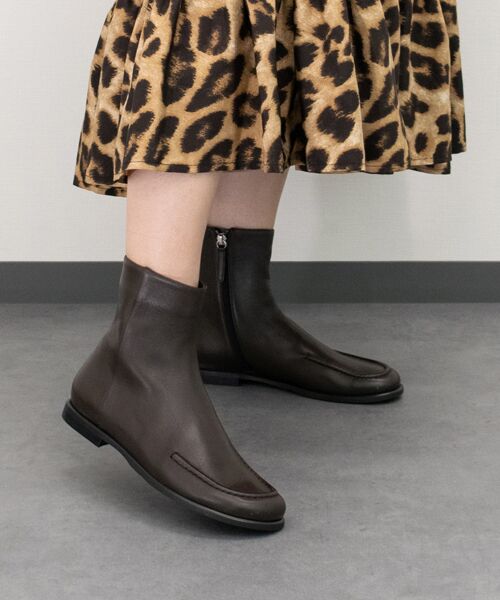 足本来の形に近いオブリークトウを採用したサイドシームショートブーツは、つまみモカのデザインが特徴的な一足。
