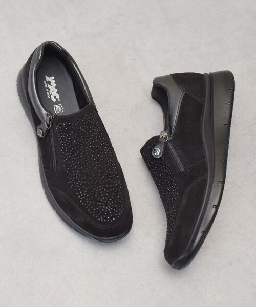 【IMAC/イマック】1975 年にデビッド&レナート・マッツォッコーニ兄弟によって IMAC Spa (イマック)が設立されました。80 年代初頭より、伝統的に北欧の国々で評価され、市場開拓のために 力を注いできた、ポリウレタン製ソールの直接注入技術による製造で、足の快適さと健康を考えた高品質の商品を生産し続けています。キラリと光るホットフィックスラインストーンが特徴的なスリッポンは、着脱し易いファスナー仕様です。