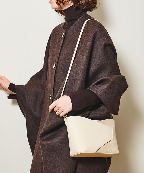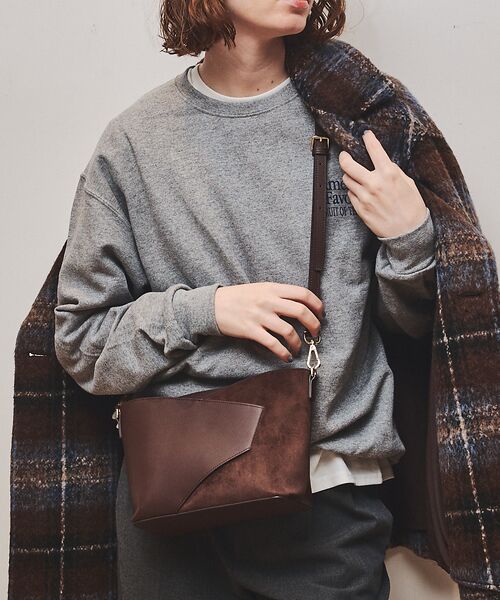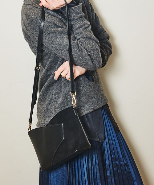 【Design】【Luce/ルーチェ】スムース牛革とスエードを組み合わせ、表情豊かで洗練されたショルダーバッグ。スマホがサッと取り出せるあおりポケットや、安心の天ファスナー付きで機能面も充実。500mlペットボトルや長財布が横にすっきり収まり、仕分けしやすい内ポケットも完備。カジュアルからフォーマルまで幅広いシーンで活躍する、実用性とデザイン性を兼ね備えた一品です。【pocket】<内側>前胴:オープンポケット×2背胴:ジップポケット×1 オープンポケット×1