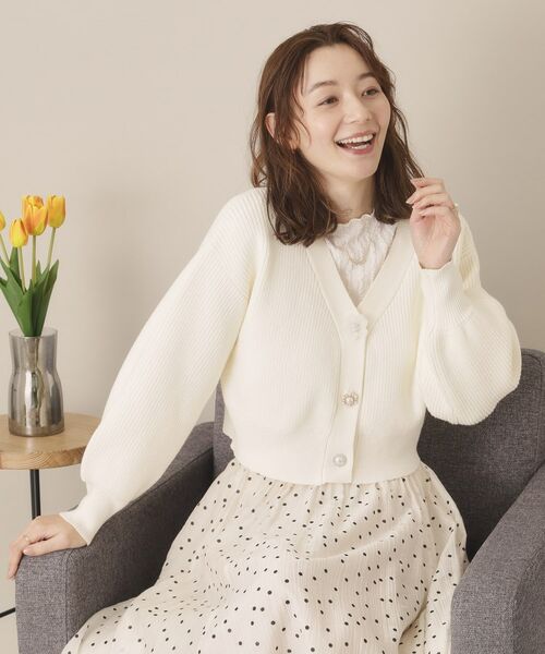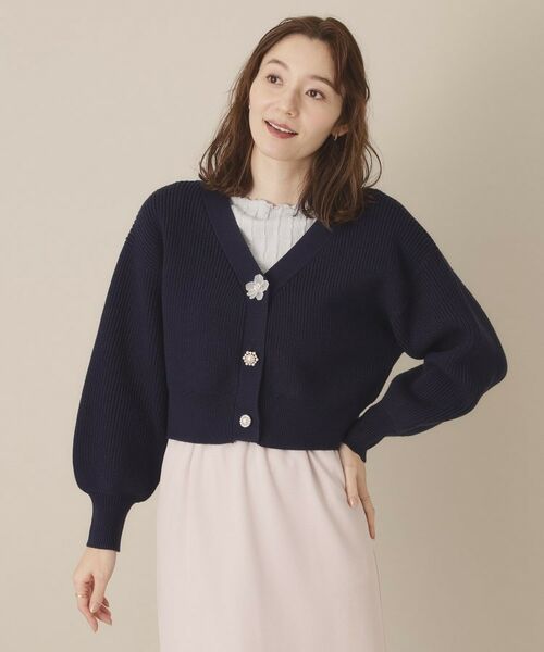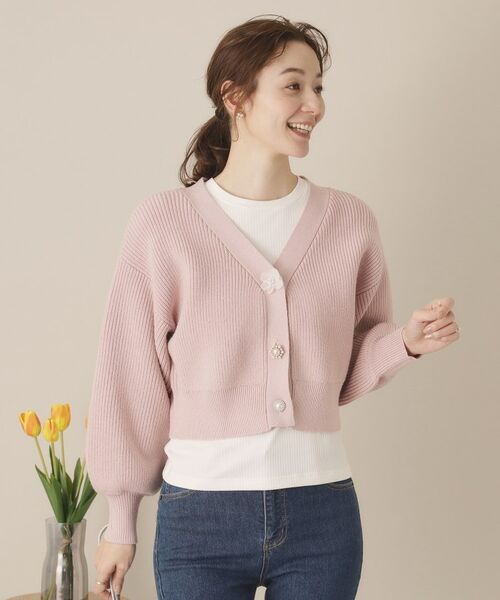 立体的なお花のボタンにきらりと輝く大きめのパール調ボタンは、見ているだけでも気分が上がります。