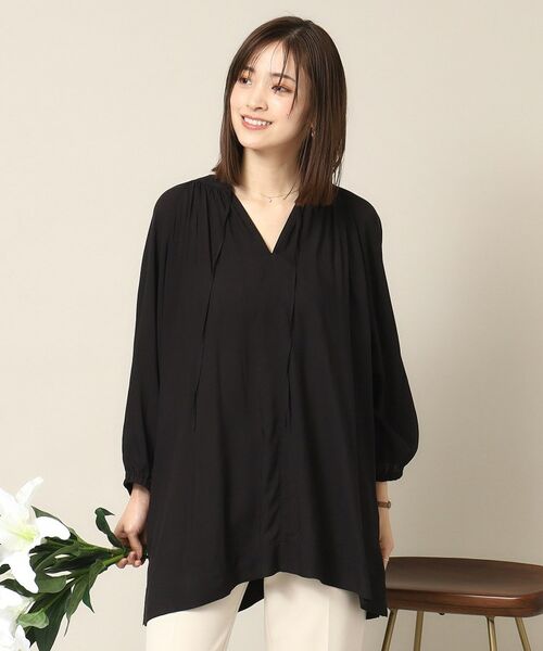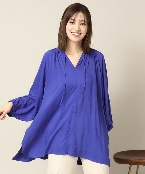 レーヨン混素材ならではのとろみ感と柔らかな着心地が魅力のスキッパーブラウス。