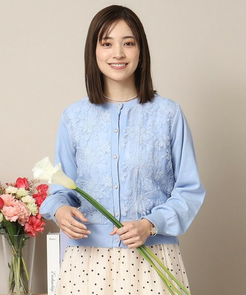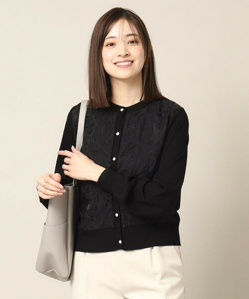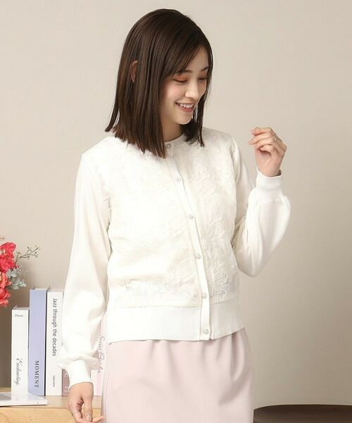 フロントの花柄レースがコーディネートを華やかに演出してくれるカーディガン。
