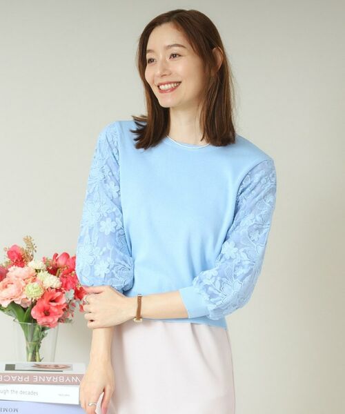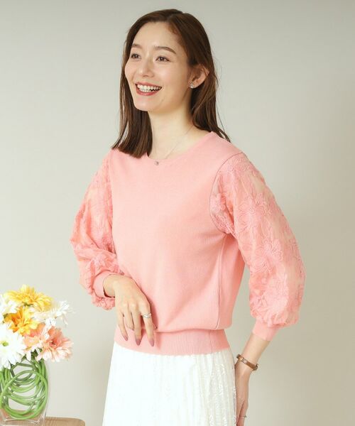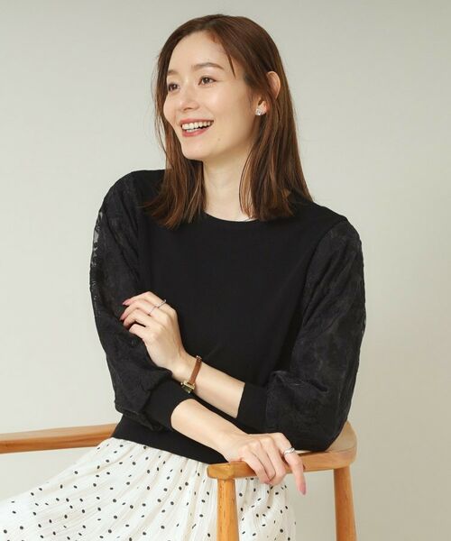 【デザイン】華やかなレース袖が大人可愛いニット。チュールレースの袖が華やかなコーディネートの主役になる一着。程よくハリのあるチュールレースを使用し、ボリューミーな袖のシルエットをつくりました。レース下にはシフォン素材を重ねることで透け感を抑え着やすくしています。裾はリブ切替でメリハリを付け自然なブラウジングが可能なスカートと相性◎なデザイン。【素材】身頃はさらりとした肌触りのレーヨン・ナイロン素材のニット。袖はシフォン素材とチュールレースの2枚仕立てになっています。※照明の関係により、実際よりも色味が違って見える場合があります。また、パソコン・スマートフォンなどの環境により、若干製品と画像のカラーが異なる場合もございます。本商品は、ご注文確定後に取り寄せにてお客様への出荷手配をさせていただきますので、お届けまでに7~10日前後かかる場合がございます。また、商品は他社サイトと在庫を共有しているため、ご注文いただいた商品が欠品となり、キャンセルとなる場合がございます。