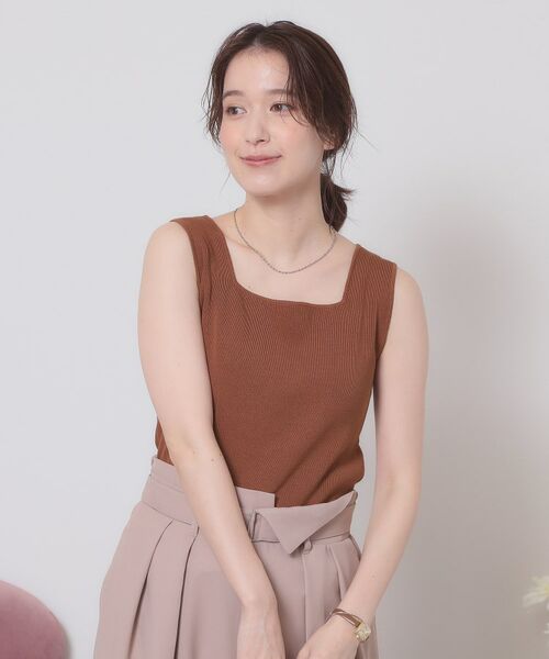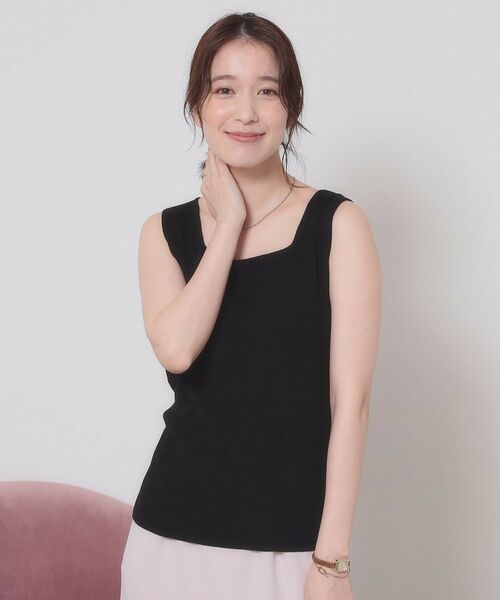 程よい開き具合のスクエアネックが着やすいニットタンクトップ。