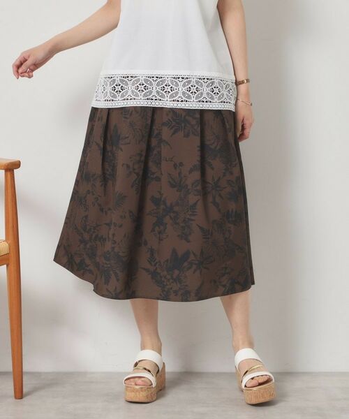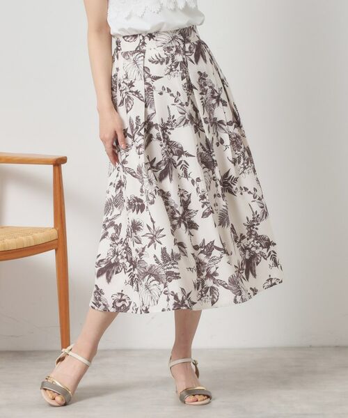 リゾートムード漂う花柄を単色使いでシックに表現した麻調合繊スカート。