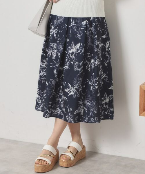 【清涼感/ウエスト後ろゴム/手洗い可】麻調花柄タックスカート