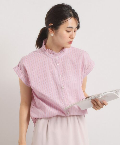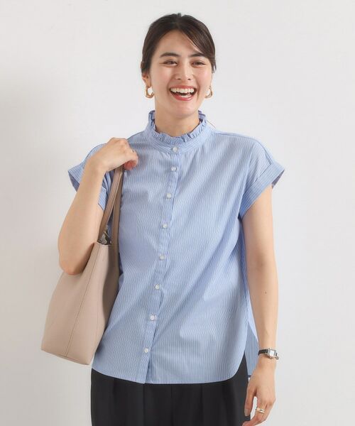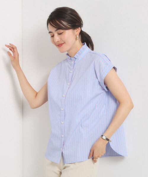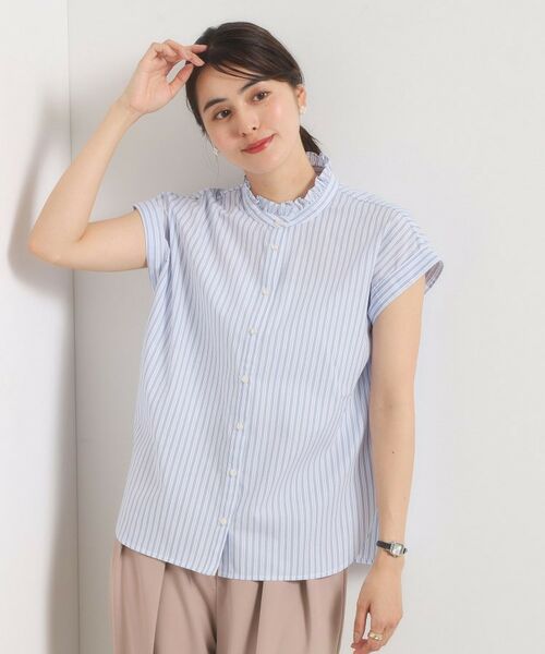 【手洗い可】スタンドフリルストライプブラウス