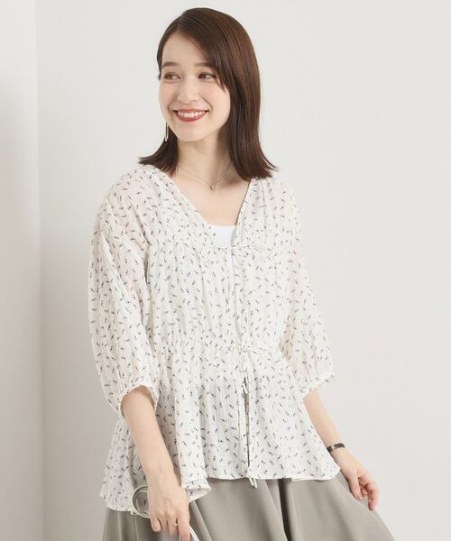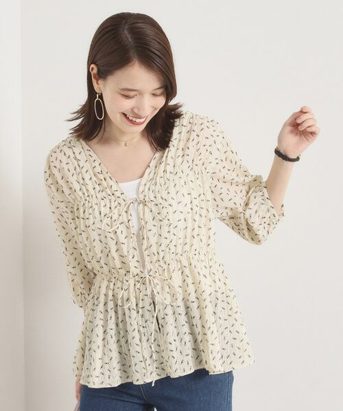前リボンデザインがトレンド感のあるシャーリングブラウス。