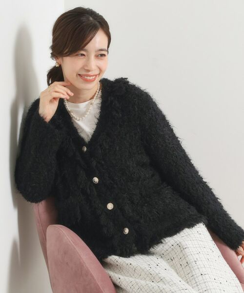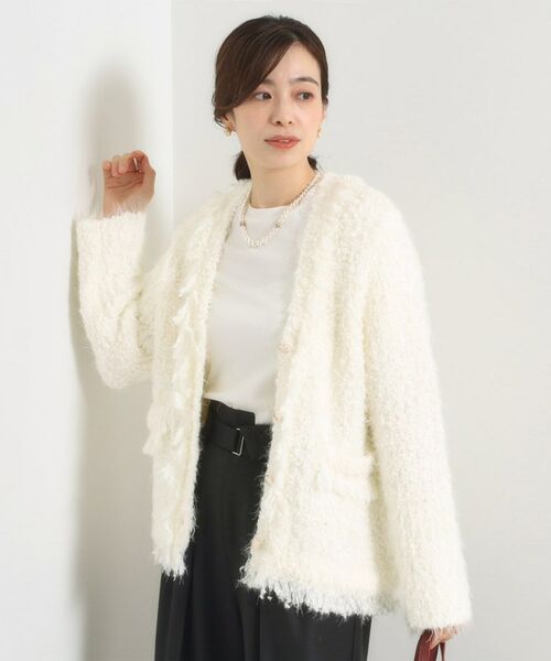 ぽこぽことした表面感ある糸に毛足のある糸を組み合わせた、ファンシーなニットジャケット。