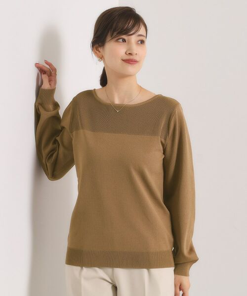 リブ編みで切り替えることで表面感を作り、顔周りが華やかに見えるデザインに。