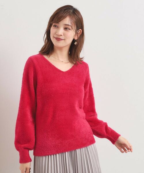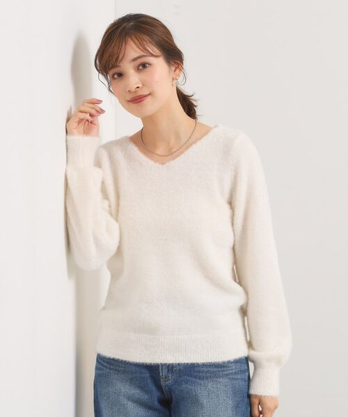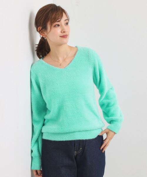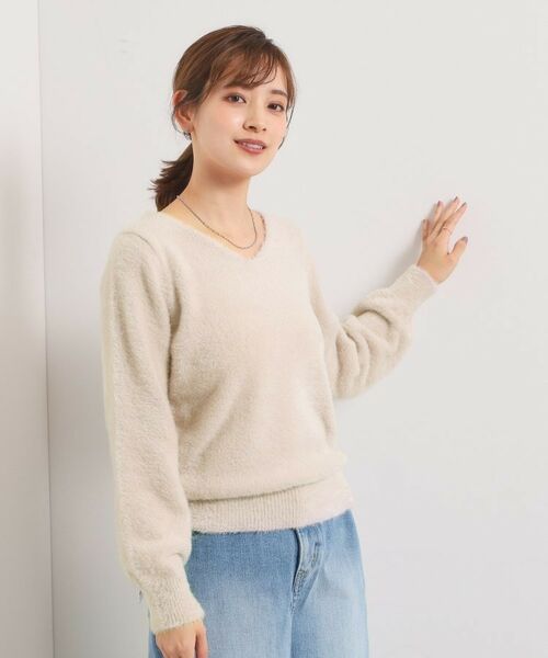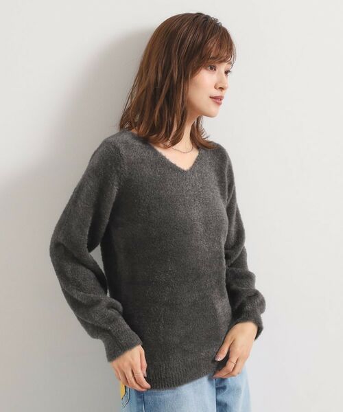 シルエットにボリュームの出やすいフェザーヤーンニットですが、Vネックデザインにすることで抜け感が生まれ、すっきりとした印象でお召し頂けます。