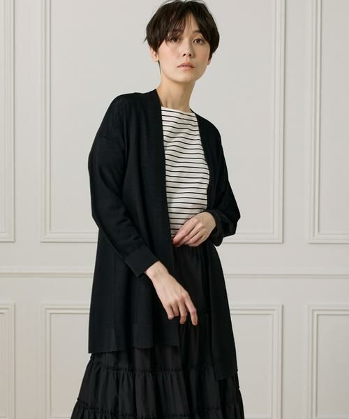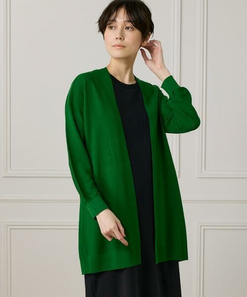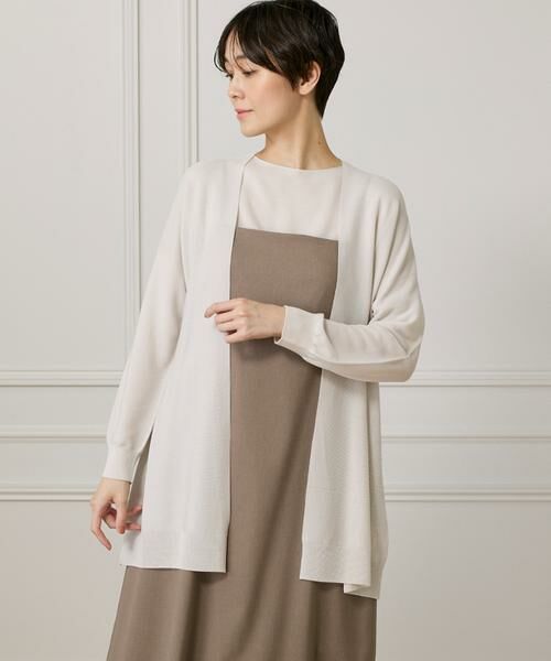 適度なドレープ感とシルクのような美しい光沢感が特徴のロングニットカーディガン。スーパーハイゲージのホールガーメント®機で繊細に編み立てました。ゆったりとしながらも落ち感があり、すっきりとしたシルエットなのでどんなコーディネートにも合わせやすい一枚です。ガーター編みの凸凹のある表面感が特徴。同素材のプルオーバーニットとのセットアップも可能です。