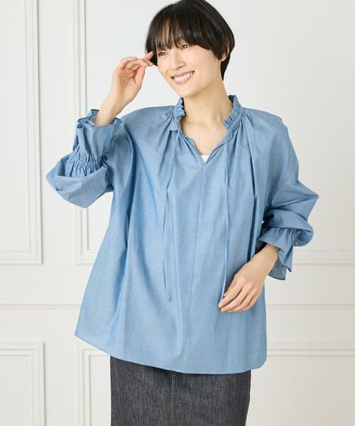 フリル&ギャザーの衿もとと、フレアーシルエットの袖口が特徴で、フェミニンな印象を与えます。綿の風合いを活かして、ナチュラルな雰囲気に仕上げました。カジュアルに着たい時は襟元のコードを結ばずに垂らしたり、きちんとした印象を出したい時はリボン結びにするなど、気分に合わせてアレンジが楽しめるアイテムです。