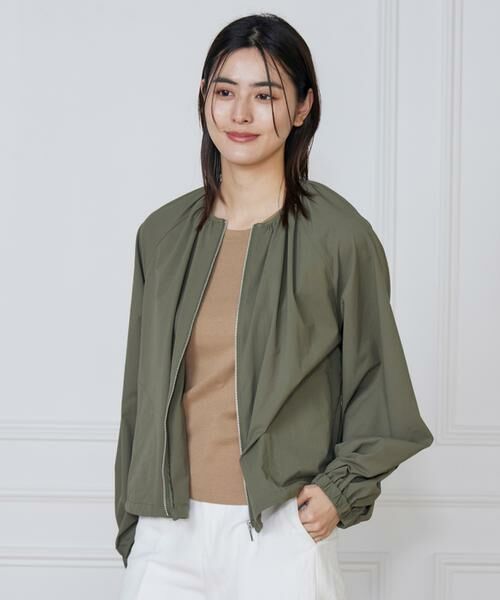 襟ぐりや袖口のギャザーがポイントのショートブルゾン。たっぷりとしたギャザーを施すことで丸みを持たせたシルエット、コンパクトな丈感でボトムとのバランスを取りやすいデザインです。裾はドローストリング仕様になっており、ボリューム感を調整できます。さらっとした風合いと縦横に伸びるストレッチ性のあるとても軽い素材でお作りしています。