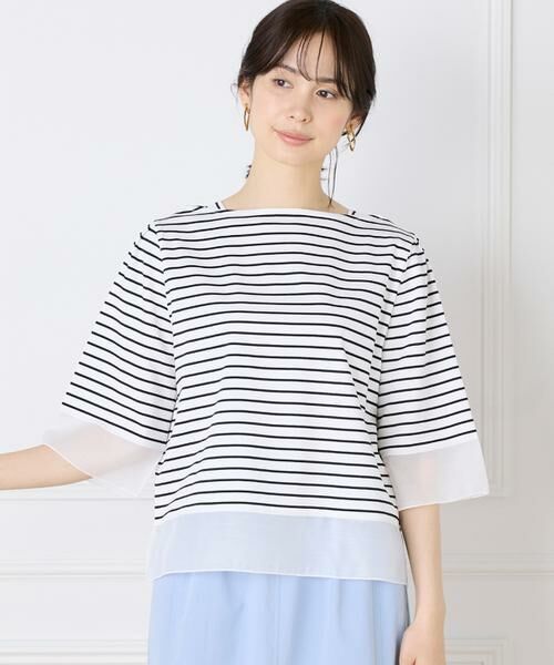 裾、袖口をシアー素材で切り替え、軽やかなデザインに仕上げたカットプルオーバー。適度に張り感のある素材とゆったりとしたサイズ感で身体のラインを拾わないのも嬉しいポイント。タックを寄せたお袖は肘丈で気になる二の腕をさりげなくカバー。すっきりとしたボートネックはサイドにマチを付けることで開きも気にならず着易さを追求しました。1枚でサマになる便利カットソーです。