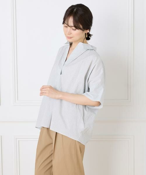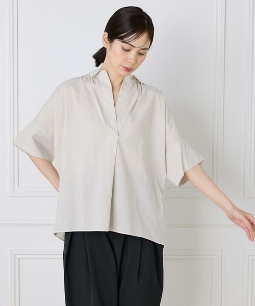 ニュアンスのあるプルオーバーシャツ。抜け感のある襟デザインや身体が泳ぐシルエットは、スタイルをより華奢に見せてくれます。袖口を折り返したり、襟を抜かせたりと着こなしをお楽しみいただけるデザインです。軽やかさと、オーガニックコットンのなめらかさがたっぷり詰まった素肌にやさしいブラウスです。風通しが良くて蒸れにくく、汗をかいても貼りつかないさらっとした着心地が特徴です。薄手のローンならではのカジュアル過ぎない上品な印象となっています。