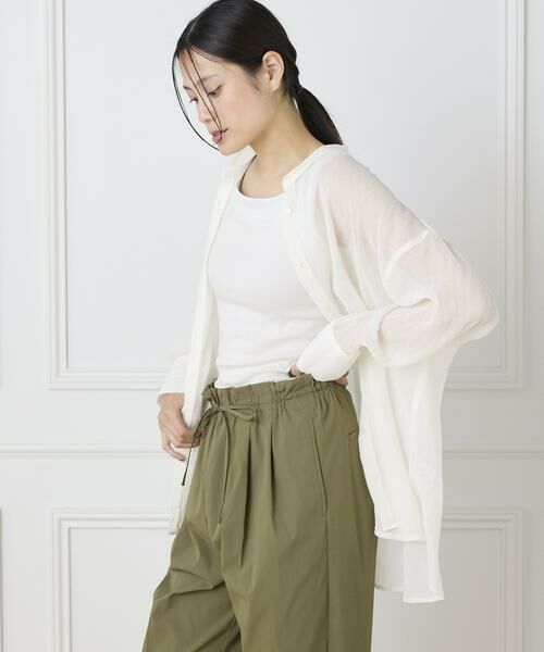 オーバーサイズなデザインですが、柔らかな楊柳素材を使用しているため適度な落ち感があり、女性らしいシルエットのシアーシャツです。ボタンをはずして羽織としてもお使いいただけるため1枚お持ちいただくとスタイリングの幅が広がる便利アイテムです。シワになりにくいので持ち運びにも◎ 太めのカフスでアクセントをつけました。