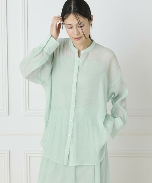 オーバーサイズなデザインですが、柔らかな楊柳素材を使用しているため適度な落ち感があり、女性らしいシルエットのシアーシャツです。ボタンをはずして羽織としてもお使いいただけるため1枚お持ちいただくとスタイリングの幅が広がる便利アイテムです。シワになりにくいので持ち運びにも◎ 太めのカフスでアクセントをつけました。
