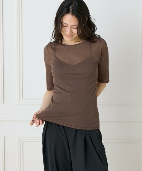 細い糸で編み立て、程よいシアー感を表現したテレコ素材を使用したハーフスリーブプルオーバー。丸編み機で編みたてた素材のため脇に縫い目がなく着心地も◎綿ナイロンの素材で適度なシャリ感が特徴で快適にお召しいただけます。すっきりとしたボートネックと華奢な襟の仕様で女性らしく仕上げました。ジャケットやカーデ、またジャンスカのインナーなど、このシアートップスをインするだけでいつものスタイリングが一気にブラッシュアップ。